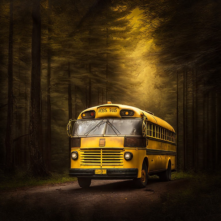 Old yellow school bus real photo from the front in the forest ultra realistic