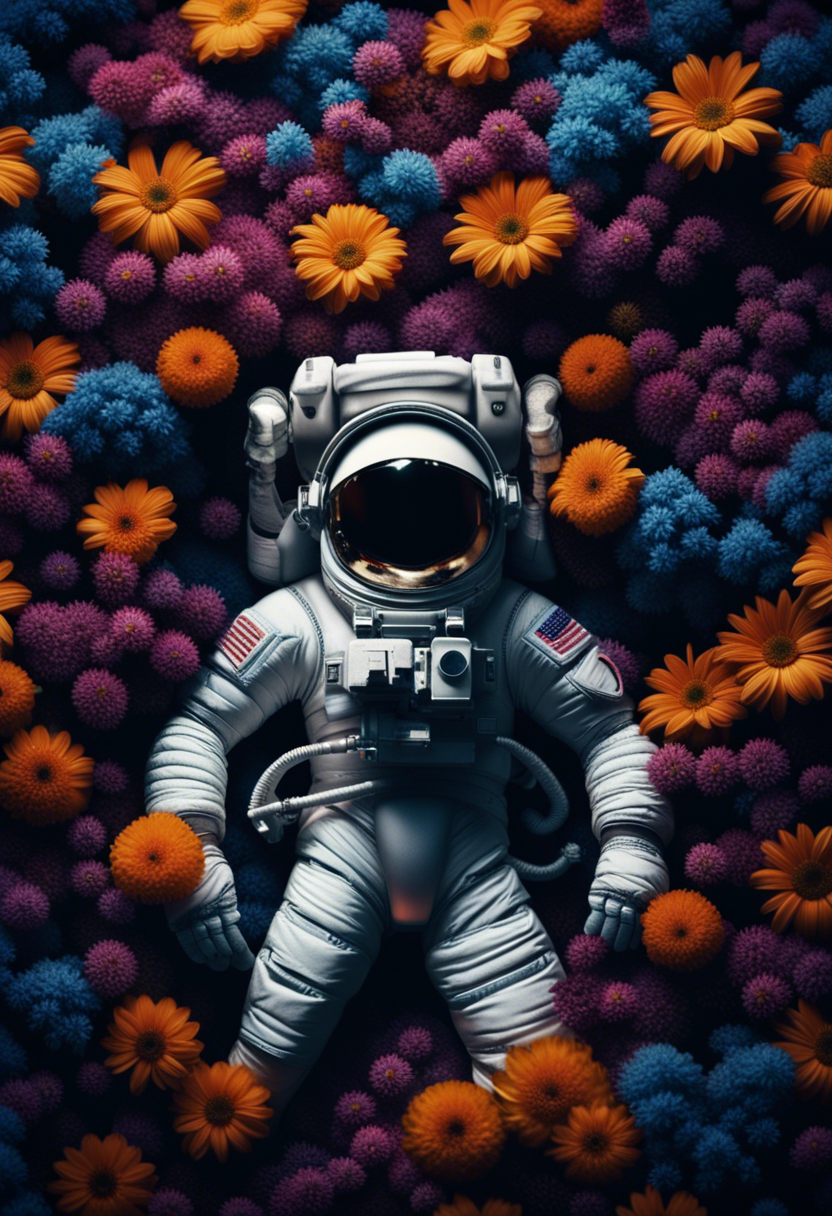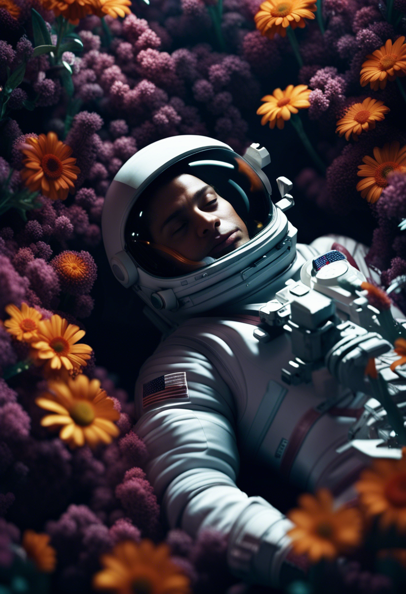 astronaut laying in flowers, top view, cinematic, dark light, beautiful colors, detailled, 4k