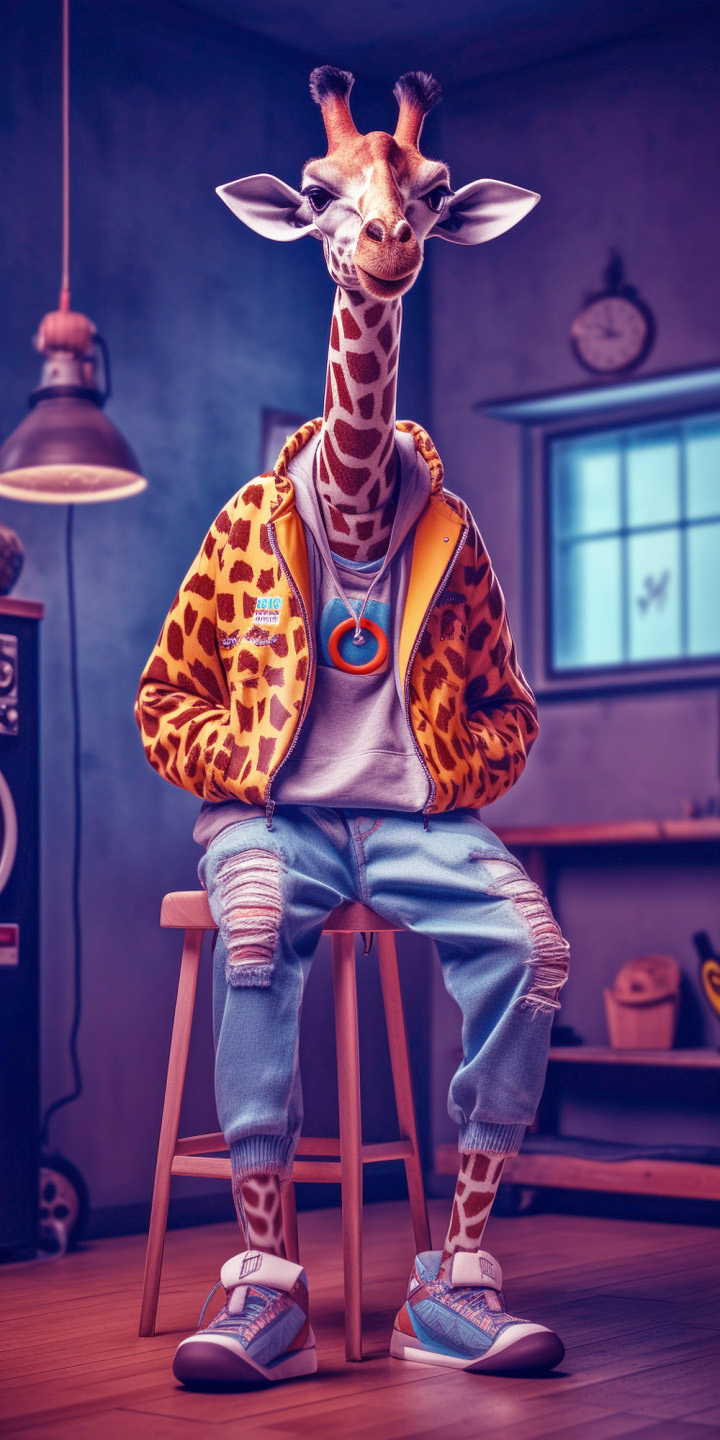 Fashion photography of a anthropomorphic giraffe dressed in large hiphop clothes from 1980s , wearing sneakers , Sony Alpha α7, ISO1900, volumetric lighting,