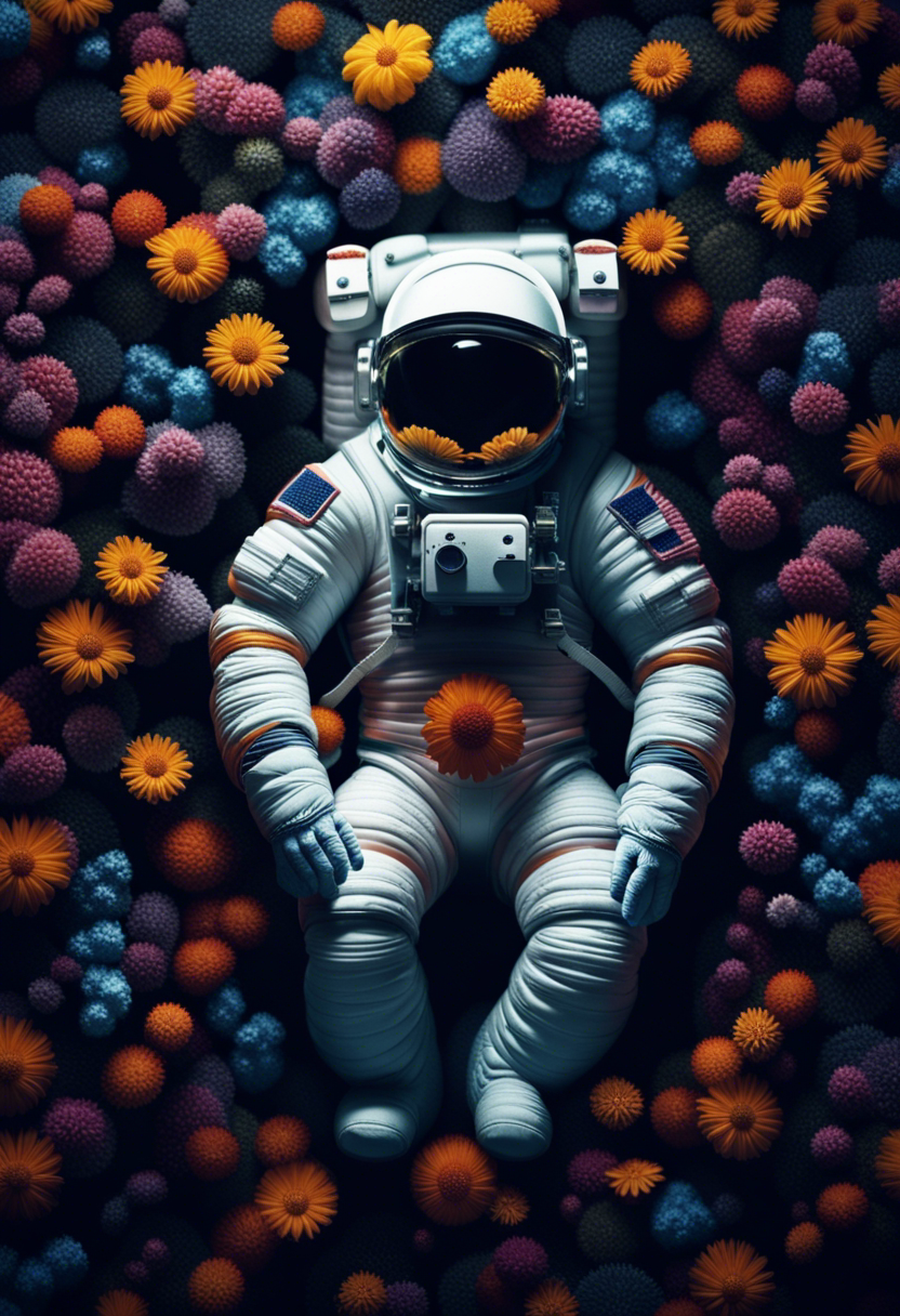 astronaut laying in flowers, top view, cinematic, dark light, beautiful colors, detailled, 4k